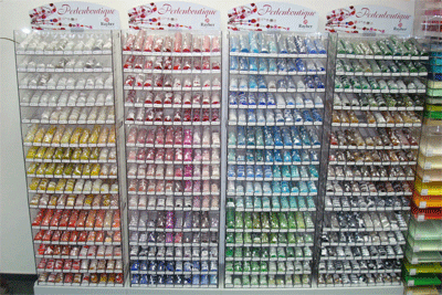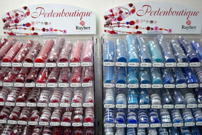 Unsere sogenannte "PERLEN-BOUTIQUE" ist eine Riesenwand an Rocailles, Swarovskysteinchen, Glasschliffperlen, Schmetterlingsperlen, Glasstiftchen natürlich alles farblich sortiert. Ein beleuchteter Perlenschrank mit Perlmuttsteine in verschiedenen Formen, und Designs mit Holzteilchen zum Modeschmuck selbst herstellen. Dazu passend: Verschlüsse in Gold und Silber, Quetschperlen, Kettchen und Ringe. |